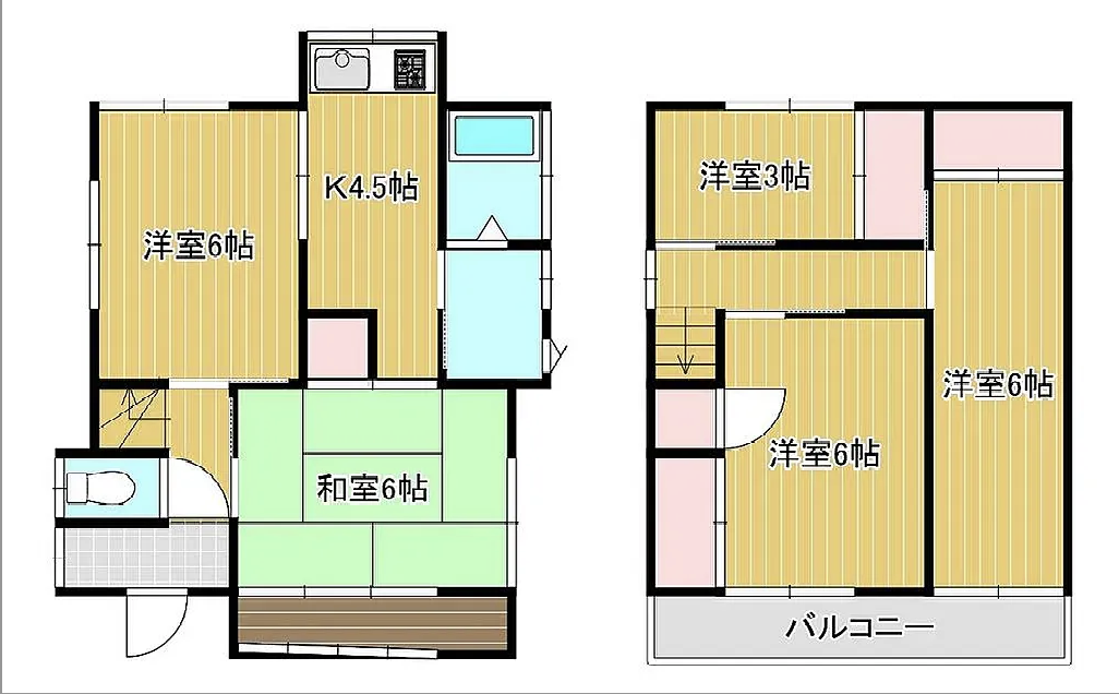 Esta es una vivienda de dos plantas con una distribución versátil. En la planta baja, se encuentra una cocina de 4.5 tatamis (aprox. 7 m² / 75 ft²), el cuarto de baño y un aseo. Este nivel también cuenta con una habitación de estilo occidental de 6 tatamis (aprox. 10 m² / 108 ft²) y una habitación de estilo japonés (washitsu) de 6 tatamis. La primera planta está dedicada a los dormitorios y se compone de tres habitaciones de estilo occidental: dos de 6 tatamis (aprox. 10 m² / 108 ft²) cada una, y una más pequeña de 3 tatamis (aprox. 5 m² / 54 ft²). Dos de estas habitaciones tienen acceso directo a un balcón compartido.