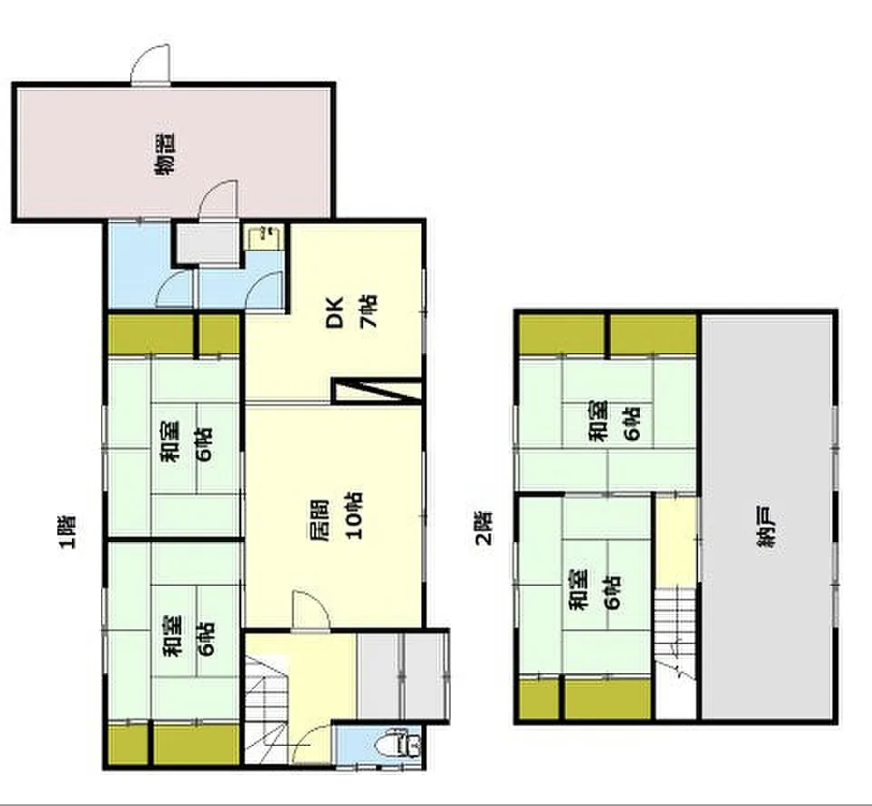 Esta casa de dos plantas ofrece una distribución espaciosa y funcional, ideal para una familia. En la primera planta (1F), se encuentran las áreas de vida principales. Cuenta con una amplia sala de estar (居間) de 10 tatamis (aproximadamente 16 m² / 178 ft²), un comedor-cocina (DK) de 7 tatamis (aprox. 11 m² / 123 ft²), y dos habitaciones de estilo japonés (和室) de 6 tatamis cada una. Un gran trastero (物置) anexo proporciona un excelente espacio de almacenamiento. La segunda planta (2F) está dedicada al descanso. Alberga dos habitaciones adicionales de estilo japonés (和室), ambas de 6 tatamis (aprox. 10 m² / 105 ft²), y destaca por un enorme trastero (納戸) que ofrece una excepcional capacidad de almacenamiento adicional.