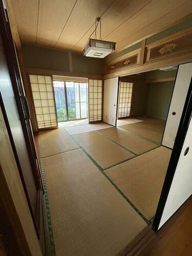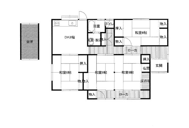 Esta casa de una sola planta presenta una distribución tipo 4DK, optimizada para la funcionalidad y el almacenamiento. El núcleo del hogar es un comedor-cocina de 8 tatamis (13 m² / 140 ft²) situado en la parte posterior. La residencia cuenta con cuatro dormitorios de estilo japonés, cada uno con una superficie de 6 tatamis (10 m² / 108 ft²), ofreciendo espacios equilibrados para la familia o invitados. El diseño está conectado por pasillos tradicionales que llevan desde la entrada (Genkan) hacia áreas de servicio independientes, que incluyen un baño, un aseo y una zona de lavabo/vestidor. Detalles arquitectónicos auténticos, como armarios empotrados (Oshiire), un nicho Tokonoma y un espacio para el altar budista, están integrados armoniosamente en las zonas de descanso.