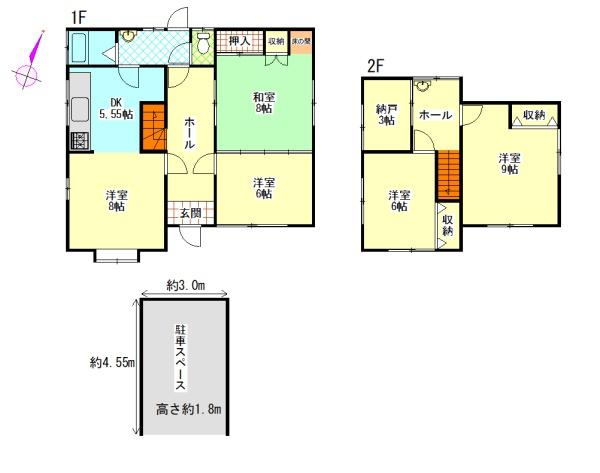 Esta espaciosa residencia de tipo 5SDK ofrece una distribución funcional y versátil, ideal tanto para familias numerosas como para inversión: Primera Planta (1F): El vestíbulo de entrada conecta con un área de cocina-comedor de 9 m² (97 ft²) y tres estancias: una habitación occidental principal de 13 m² (140 ft²), una habitación tradicional japonesa de tatami de 13 m² (140 ft²) con armarios integrados y otra habitación occidental de 10 m² (108 ft²). Incluye baño completo con aseo y lavabo independientes. Segunda Planta (2F): Este nivel cuenta con dos amplios dormitorios occidentales: uno principal de 15 m² (161 ft²) y otro de 10 m² (108 ft²), ambos con armarios empotrados. Además, dispone de un trastero dedicado de 5 m² (54 ft²) y un segundo lavabo para mayor comodidad. Estacionamiento: La propiedad incluye una plaza de aparcamiento privada en el sitio (aprox. 3.0m x 4.5m).
