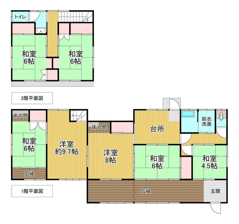 Esta espaciosa residencia de dos plantas ofrece una distribución versátil que combina elementos tradicionales japoneses con habitaciones de estilo occidental, ideal para una familia numerosa o para adaptarla a diferentes usos. En la planta baja, la entrada (玄関) conduce a un pasillo que distribuye el espacio. Inmediatamente a la derecha hay dos habitaciones de tatami de estilo japonés, una de 4.5 esteras (aproximadamente 7 m² / 78 ft²) y otra de 6 esteras (aprox. 10 m² / 105 ft²). Junto a estas se encuentra la cocina (台所), el cuarto de baño y el vestidor (脱衣洗面). La parte izquierda de esta planta está ocupada por dos amplias habitaciones de estilo occidental, una de 8 esteras (aprox. 13 m² / 139 ft²) y otra más grande de aproximadamente 9.7 esteras (aprox. 16 m² / 169 ft²). Una veranda cubierta tradicional ("hiroen" / 広縁) se extiende a lo largo de la fachada sur de la casa, conectando varias de estas habitaciones y proporcionando un agradable espacio de transición. La segunda planta, más compacta y privada, alberga dos habitaciones adicionales de tatami, ambas de 6 esteras (aprox. 10 m² / 105 ft² cada una), perfectas para ser utilizadas como dormitorios o un estudio tranquilo. Para mayor comodidad, en esta planta también se encuentra un aseo (トイレ) independiente.