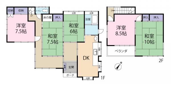 Esta propiedad de dos plantas con distribución 5DK presenta un diseño práctico y espacioso que combina elementos tradicionales japoneses y modernos. El primer piso se abre con una acogedora entrada que conduce a un área central de comedor y cocina (DK), un baño completo y un aseo separado. Ofrece tres espacios habitables distintos a lo largo de un pasillo de conexión: una habitación tradicional de Tatami de 10 m² (105 ft²) con un encantador ventanal, una habitación de Tatami de 12 m² (131 ft²) que cuenta con un nicho clásico (tokonoma) y espacio de armario, y una habitación de estilo occidental de 12 m² (131 ft²) equipada con almacenamiento integrado. Al subir al segundo piso, el diseño proporciona dos dormitorios de generosas dimensiones: una amplia habitación de Tatami de 16 m² (174 ft²) con amplio espacio de guardarropas, y una habitación de estilo occidental de 14 m² (148 ft²) que se abre directamente a un balcón, asegurando un ambiente de vida cómodo y bien ventilado.