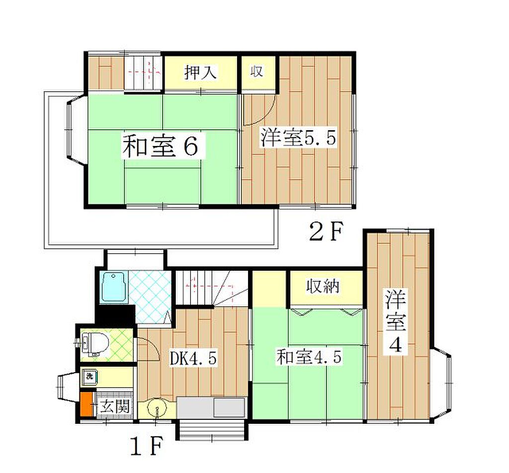 Esta casa 4DK de dos plantas ofrece una práctica combinación de espacios tradicionales y modernos. El primer piso cuenta con una entrada clásica (genkan) que pasa por el cuarto de baño y el inodoro separado, conduciendo a una zona compacta de cocina-comedor (DK) de aproximadamente 7.3 m² (78 ft²). Adyacente a la cocina hay una habitación tradicional japonesa de tatami, también de 7.3 m² (78 ft²), equipada con almacenamiento integrado. Esta habitación se conecta directamente a una habitación de estilo occidental de 6.5 m² (70 ft²) con suelo de madera en el extremo más alejado. Subiendo al segundo piso, encontrará dos dormitorios privados: una espaciosa habitación tradicional de tatami de 9.7 m² (105 ft²) con un armario profundo de estilo japonés (oshiire), y un dormitorio de estilo occidental de 8.9 m² (96 ft²) con armario estándar. Esta distribución separa eficazmente las áreas de estar y comedor en la planta baja de los tranquilos dormitorios en la planta alta.