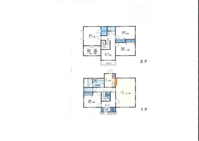 Esta es una moderna casa familiar de dos plantas con un diseño diáfano y luminoso. La planta baja (1F) es el espacio principal de la vivienda. Cuenta con una gran zona de estar/comedor de planta abierta (LD) de 13.5 tatamis (aproximadamente 22 m²), conectada a una cocina (K). Esta planta también incluye una habitación de estilo occidental (洋室) de 4.4 tatamis (aproximadamente 7 m²), perfecta como despacho o cuarto de invitados, junto con las instalaciones del baño principal. La primera planta (2F) es la zona de descanso privada. Consta de tres dormitorios de estilo occidental (洋室) de varios tamaños (8.2, 5.9 y 5.9 tatamis). El dormitorio principal está equipado con un gran vestidor. Esta planta también cuenta con un atrio (吹抜) que crea una sensación de amplitud y luminosidad, un balcón (ベランダ) y un práctico segundo aseo.