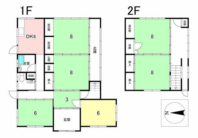 Primera Planta (1F): Gran Espacio Social La planta baja presenta un diseño tradicional enfocado en la amplitud y la recepción de visitas. Zona de Entrada: El recibidor central (Genkan) conduce a un vestíbulo de 3 tatamis (aprox. 5 m² / 54 ft²). A los lados hay dos habitaciones: una habitación japonesa de 6 tatamis (aprox. 10 m² / 107 ft²) a la izquierda, y otra habitación de 6 tatamis (probablemente estilo occidental, en amarillo) a la derecha. Salón Principal: El corazón de la casa consta de dos grandes habitaciones japonesas de 8 tatamis (aprox. 13 m² / 140 ft² c/u) conectadas entre sí. Estas se abren a una amplia Engawa (galería/veranda cerrada) en el lado este. Área de Servicio: La Cocina-Comedor (DK) de 6 tatamis (aprox. 10 m² / 107 ft²) se encuentra en la parte trasera, junto al baño y el aseo. Segunda Planta (2F): Zona Privada Espaciosa El piso superior está dedicado a los dormitorios con mucho espacio. Dormitorios: Cuenta con dos grandes habitaciones japonesas de 8 tatamis (aprox. 13 m² / 140 ft² c/u) interconectadas. Almacenaje: La planta está equipada con armarios profundos (Oshiire) a lo largo de la pared oeste y una alcoba tradicional (Tokonoma) en la habitación norte.