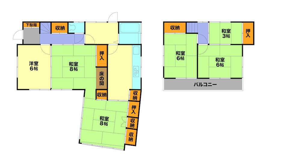 La propiedad presenta una distribución tradicional y espaciosa de dos plantas. La planta baja le da la bienvenida con un área de entrada que cuenta con un zapatero integrado, conduciendo a un pasillo que proporciona acceso a un espacio de cocina dedicado, un lavabo, un cuarto de baño y un aseo separado. Los espacios habitables principales en esta planta incluyen una habitación de estilo occidental de 10 m² (105 ft²) y dos habitaciones tradicionales japonesas con tatami de 13 m² (140 ft²) cada una. Ambas habitaciones de tatami ofrecen un amplio espacio de armario empotrado, y una de ellas cuenta además con un clásico 'tokonoma' (nicho decorativo). Al subir a la primera planta, encontrará tres habitaciones adicionales con tatami japonés. Dos de estas habitaciones miden 10 m² (105 ft²) cada una, mientras que la tercera es un espacio más íntimo de 5 m² (52 ft²) que incluye su propio armario. Un balcón amplio y compartido se extiende por el exterior, accesible directamente desde las dos habitaciones de tatami más grandes en este nivel superior, proporcionando una agradable conexión con el exterior.