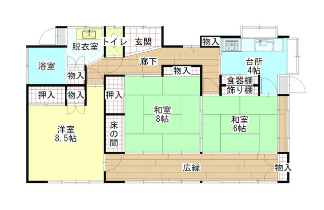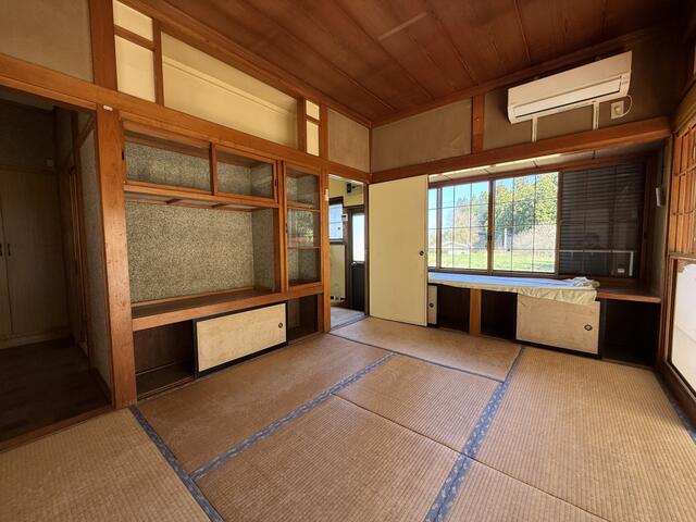 Esta casa de una sola planta cuenta con una funcional distribución 3K (3 Habitaciones + Cocina). Desde la entrada, un pasillo da acceso al área de servicios a la izquierda, que incluye un inodoro separado, un lavabo y un cuarto de baño. Junto al lavabo hay un dormitorio de estilo occidental de aproximadamente 14 m² (148 ft²) equipado con armarios empotrados. El centro de la casa cuenta con dos habitaciones tradicionales japonesas de tatami: una espaciosa habitación de 13 m² (140 ft²) que presenta un clásico tokonoma (nicho decorativo) y una habitación adyacente de 10 m² (105 ft²). Ambas habitaciones de tatami se abren a un engawa, un pasillo tradicional cerrado tipo solárium que corre a lo largo del borde sur, perfecto para relajarse. En el lado derecho se encuentra una cocina de 6 m² (70 ft²) con acceso exterior y espacio de almacenamiento integrado. La propiedad incluye múltiples armarios de almacenamiento distribuidos convenientemente por toda la casa.
