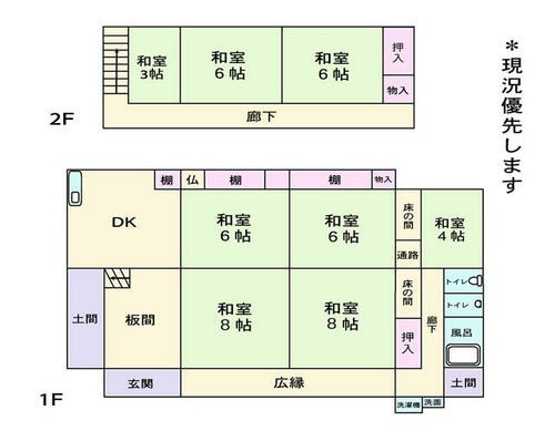 La planta baja presenta un diseño clásico japonés centrado en la amplitud. Se accede por un Genkan (recibidor) que lleva a un Doma (zona de suelo de tierra tradicional) y una habitación con suelo de madera. El núcleo de la casa lo forman dos grandes habitaciones de 8 tatamis (aprox. 13 m² / 140 ft² c/u) que se abren a una Engawa (galería/veranda soleada). La zona de Cocina-Comedor (DK) conecta con dos habitaciones de 6 tatamis (aprox. 10 m² / 105 ft² c/u) y una habitación más pequeña de 4 tatamis (aprox. 6.5 m² / 70 ft²). El baño, los aseos separados y la zona de lavandería están convenientemente agrupados en el lado este.