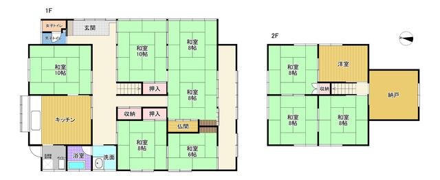 La primera planta (1F) funciona como el corazón de la vida diaria. Alrededor de la cocina (キッチン), se distribuyen cinco enormes habitaciones de estilo japonés (和室): dos de 10 tatamis (aprox. 16 m² / 174 ft² cada una), dos de 8 tatamis (aprox. 13 m² / 140 ft² cada una) y una de 6 tatamis (aprox. 10 m² / 105 ft²). Esta planta cuenta con la entrada principal (玄関), un cuarto de baño (浴室) y aseos separados.