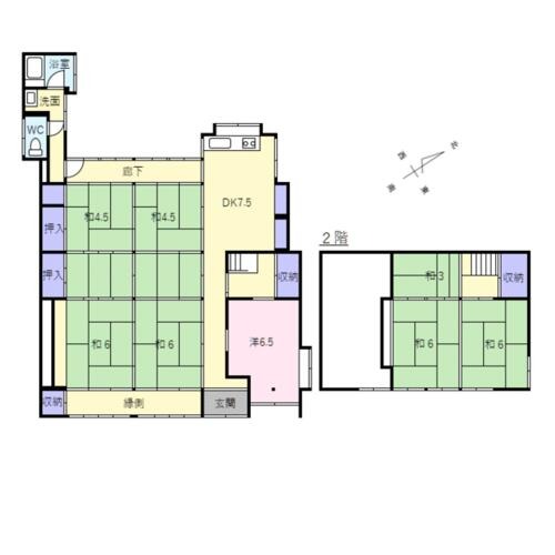 La primera planta (1F) es el corazón de la actividad diaria. Cuenta con una entrada (玄関) y un área de comedor-cocina (DK) de 7.5 tatamis (aprox. 12 m² / 131 ft²). Este nivel alberga una increíble cantidad de habitaciones: una de estilo occidental (洋室) de 6.5 tatamis (aprox. 11 m² / 113 ft²) y cuatro habitaciones de estilo japonés (和室), dos de 6 tatamis (aprox. 10 m² / 105 ft² cada una) y dos de 4.5 tatamis (aprox. 7 m² / 79 ft² cada una). La zona de aguas, con baño (浴室), lavabo (洗面) y aseo (WC), está convenientemente agrupada. Una veranda tradicional (縁側) bordea las habitaciones del sur.