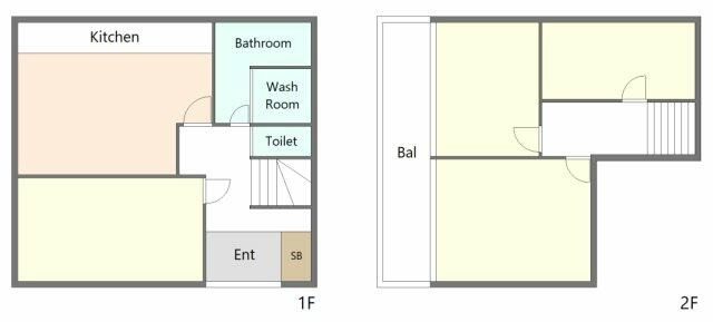 Planta Baja (1F): Al ingresar por la entrada (Ent), que cuenta con un armario para zapatos (SB), se accede a las áreas comunes. Esta planta dispone de una cocina, un comedor y una sala de estar. Adicionalmente, se encuentran las instalaciones sanitarias: un cuarto de baño completo, una sala de lavado (Wash Room) y un aseo independiente (Toilet).