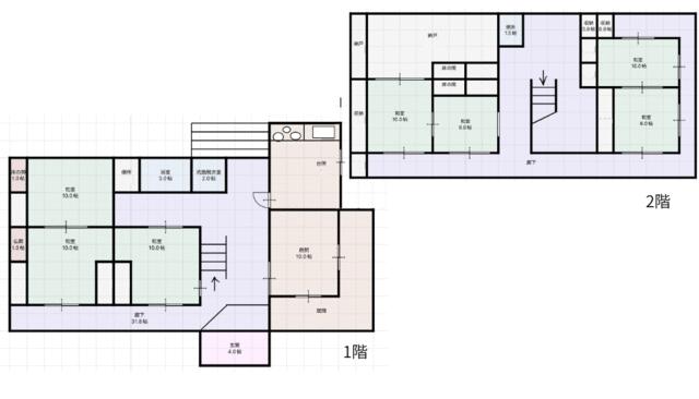 La casa se abre con un amplio Recibidor de 4 tatamis (aprox. 6.5 m² / 70 ft²) que da paso a un inmenso Pasillo de 31.8 tatamis (aprox. 51.5 m² / 554 ft²) que conecta toda la planta. La zona habitable principal consta de tres grandes habitaciones japonesas de 10 tatamis (aprox. 16.2 m² / 174 ft² cada una), ideales para reuniones. Adyacente a estas se encuentra una Cocina/Comedor de 10 tatamis en el lado este. La planta también incluye habitaciones auxiliares más pequeñas (3 y 2 tatamis) y zonas húmedas (aseo/lavabo) cerca de la cocina.