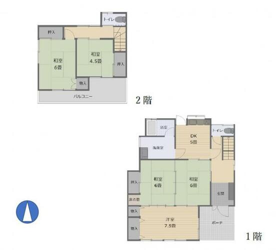 Esta casa de dos plantas bien organizada con distribución 5DK ofrece una mezcla armoniosa de espacios de vida tradicionales y occidentales. En la primera planta, la entrada principal conduce directamente a una habitación de estilo occidental de 12 m² (131 pies cuadrados) equipada con un amplio espacio de almacenamiento empotrado. El núcleo de la planta baja cuenta con dos habitaciones tradicionales japonesas con suelo de tatami interconectadas, cada una de aproximadamente 10 m² (105 pies cuadrados), que incluyen armarios clásicos y un nicho decorativo (tokonoma). Hacia la parte trasera, hay una funcional cocina-comedor (DK) de 8 m² (87 pies cuadrados) situada junto a un cuarto de lavabos, un cuarto de baño y un aseo independiente convenientemente agrupados. La segunda planta ofrece la comodidad añadida de un segundo aseo y cuenta con dos dormitorios distintos de estilo japonés con tatami, que miden 10 m² (105 pies cuadrados) y 7 m² (78 pies cuadrados), respectivamente. Ambas habitaciones superiores incluyen armarios empotrados y ofrecen acceso directo a un amplio balcón compartido.