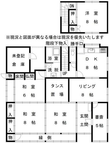 El primer piso (1F) presenta un diseño tradicional espacioso centrado en tres habitaciones japonesas de Tatami: dos habitaciones de 8 tatamis (aprox. 13 m² / 140 ft² cada una) y una de 6 tatamis (aprox. 10 m² / 105 ft²), hermosamente bordeadas por un clásico pasillo soleado (Engawa). Además, esta planta ofrece una sala de estar de 8 tatamis (aprox. 13 m² / 140 ft²), una zona de Comedor y Cocina (DK) separada de 8 tatamis (aprox. 13 m² / 140 ft²) y un estudio de 5 tatamis (aprox. 8 m² / 87 ft²) convenientemente ubicado cerca de la entrada principal. La planta alberga de forma integral las instalaciones sanitarias principales (un baño completo, un cuarto de lavado y un inodoro), un espacio dedicado para armarios y un almacén anexo no registrado para mayor utilidad. El segundo piso (2F) proporciona un refugio privado y moderno, que consta de un único dormitorio de estilo occidental de 8 tatamis (aprox. 13 m² / 140 ft²). Esta habitación está diseñada de manera eficiente con armarios empotrados para maximizar el espacio habitable.