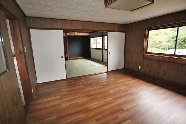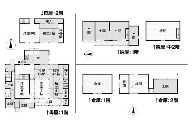 Esta es una gran finca que consta de múltiples edificaciones: una casa principal de dos plantas y dos grandes anexos, también de dos plantas cada uno, que ofrecen un enorme potencial para almacenamiento, talleres o reconversión. La Casa Principal (母屋) combina estilos japonés y occidental. La planta baja cuenta con un comedor-cocina (DK), dos habitaciones de estilo occidental (洋室) de 6 tatamis (aprox. 10 m² / 105 ft² cada una) y tres habitaciones de estilo japonés (和室). Una amplia veranda tradicional (広縁) conecta varios de estos espacios. La primera planta es más privada y alberga dos grandes habitaciones, una occidental y una japonesa, ambas de 8 tatamis (aprox. 13 m² / 140 ft²). Los dos edificios anexos (納屋 y 倉庫) proporcionan un vasto espacio adicional. Uno funciona como un granero con suelos de tierra en la planta baja y una gran sala de madera en la superior. El otro es un almacén (倉庫) en la planta baja, con más salas y espacios de almacenamiento en el segundo nivel.