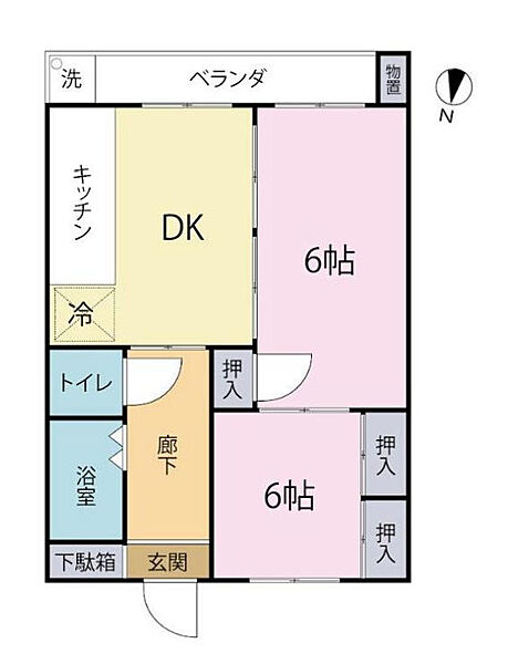 Esta funcional unidad 2DK presenta una distribución bien separada que maximiza la privacidad y la utilidad. Al entrar en el vestíbulo (Genkan), que incluye un armario para zapatos empotrado, un pasillo central da acceso a un aseo independiente y a un cuarto de baño dedicado. La zona habitable consta de dos amplias habitaciones, cada una de 6 tatamis (aprox. 10 m² / 105 ft²). La primera habitación está situada cerca de la entrada y cuenta con armario empotrado (Oshi-ire). La segunda habitación se une a la zona de Comedor/Cocina (DK), creando un espacio de vida fluido. Tanto la cocina como la habitación posterior se abren directamente a un amplio balcón orientado al sur, que está equipado con conexiones para lavadora e incluye un armario de almacenamiento exterior, asegurando una excelente ventilación y luz natural.